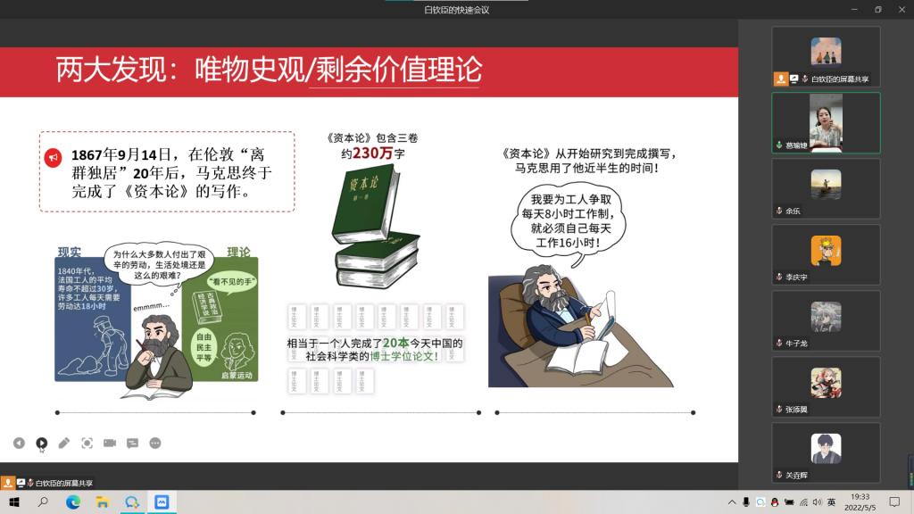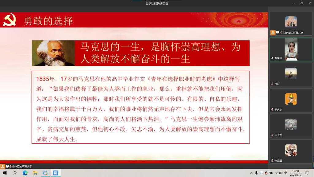 5月5日是马克思的诞辰,为纪念马克思诞辰204周年,同时重温习近平总书记在纪念马克思诞辰200周年大会上的重要讲话精神。太阳成集团tyc122ccvip本科生第三党支部于2022年5月5日召开“纪念马克思诞辰204周年,争做新时代有为青年”线上专题党课,以支部书记讲党课的形式向革命导师致敬。