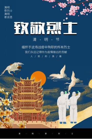 此作品的构图要素为黄鹤楼、樱花、抗疫医护人员、仙鹤及朝阳。海报采用墨蓝色背景,金粉点缀,活泼不失沉稳,盛开的樱花代表着抗疫中的点点希望,与下方的黄鹤楼首尾呼应,缅怀武汉抗疫中牺牲的党员战士和医护人员。升起的朝阳代表勇往直前的抗疫英雄的蓬勃之姿。“致敬烈士”四字方方正正,给人一种沉稳厚重的视觉感,突显出清明气节的重要性。底部的黑色带饰以“清明祭烈士”突出主题,飞舞的仙鹤朝向黄鹤楼,传达出庄严的致敬情怀、铭记人民英雄的信念。