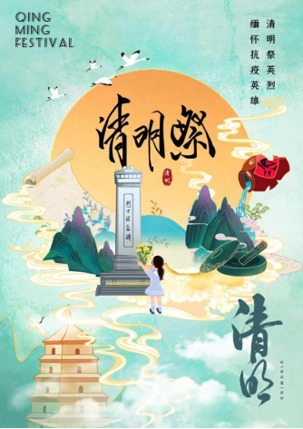 此作品中字体主要采用传统毛笔字形,突显出清明节是中国的传统节日,其次构图元素主要为青山、流水、飞鸟、清酒、端砚等,表现出清明时节古人踏青集会、流觞作赋的传统活动习俗,展现了中华民族悠久的历史积淀和文化底蕴;海报中心是一位向烈士纪念碑献花的小女孩,提醒我们要铭记历史,谨记革命先烈做出的英勇牺牲,左下方流云象征云梯,通过攀登向革命先烈致敬,彰显革命英雄高大伟岸的形象。同时,献花的小女孩隐喻学习、继承、发扬革命精神,需要从小抓起,厚植家国情怀,为新时代伟大复兴中国梦蓝图的构建添砖加瓦。