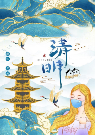 此作品主视觉“清明”两字暗合主题、毛笔字体更彰显清明节气的传统人文性。以蓝色为底、鎏金点缀,峰峦叠嶂,碧水如镜,明快鲜亮的色泽搭配,多个细碎图形统合在一起,海报版式为“紧-散-紧”式,错落有序,给人以一种轻松释怀感。海报中的紫衣少女佩戴口罩、闭眼缅怀悼念,传达无限敬畏之情,仙鹤与上方蓝色鎏金云彩相呼应,象征着天上人间的仙境,寓意着对革命先烈的美好祝福。总体构图上覆盖四角,进一步体现出古韵味及东方美。望长天忆故人,先人如阳光为我们开辟光明之路。