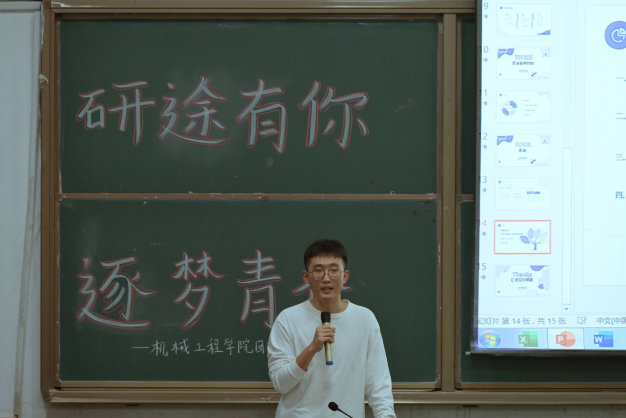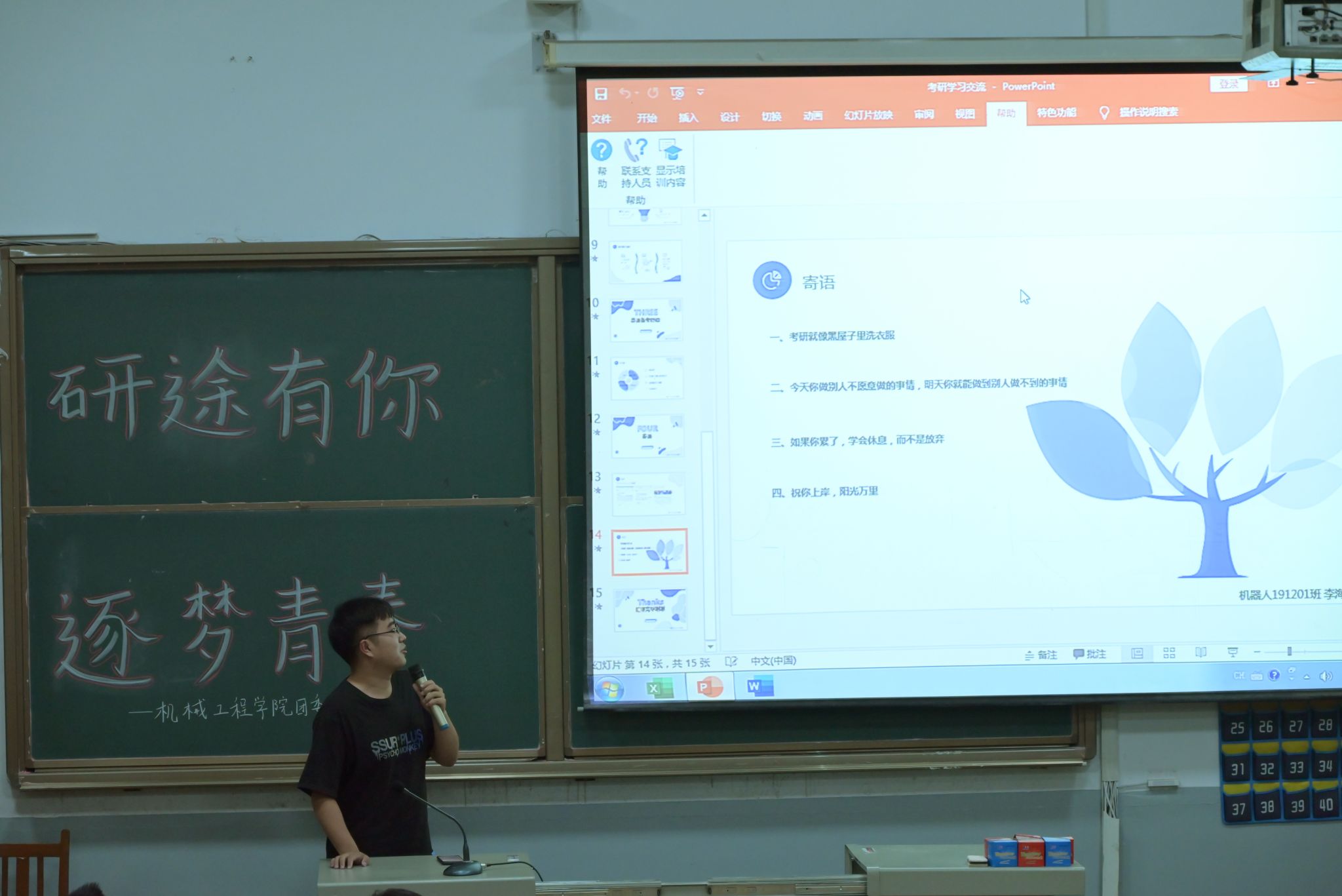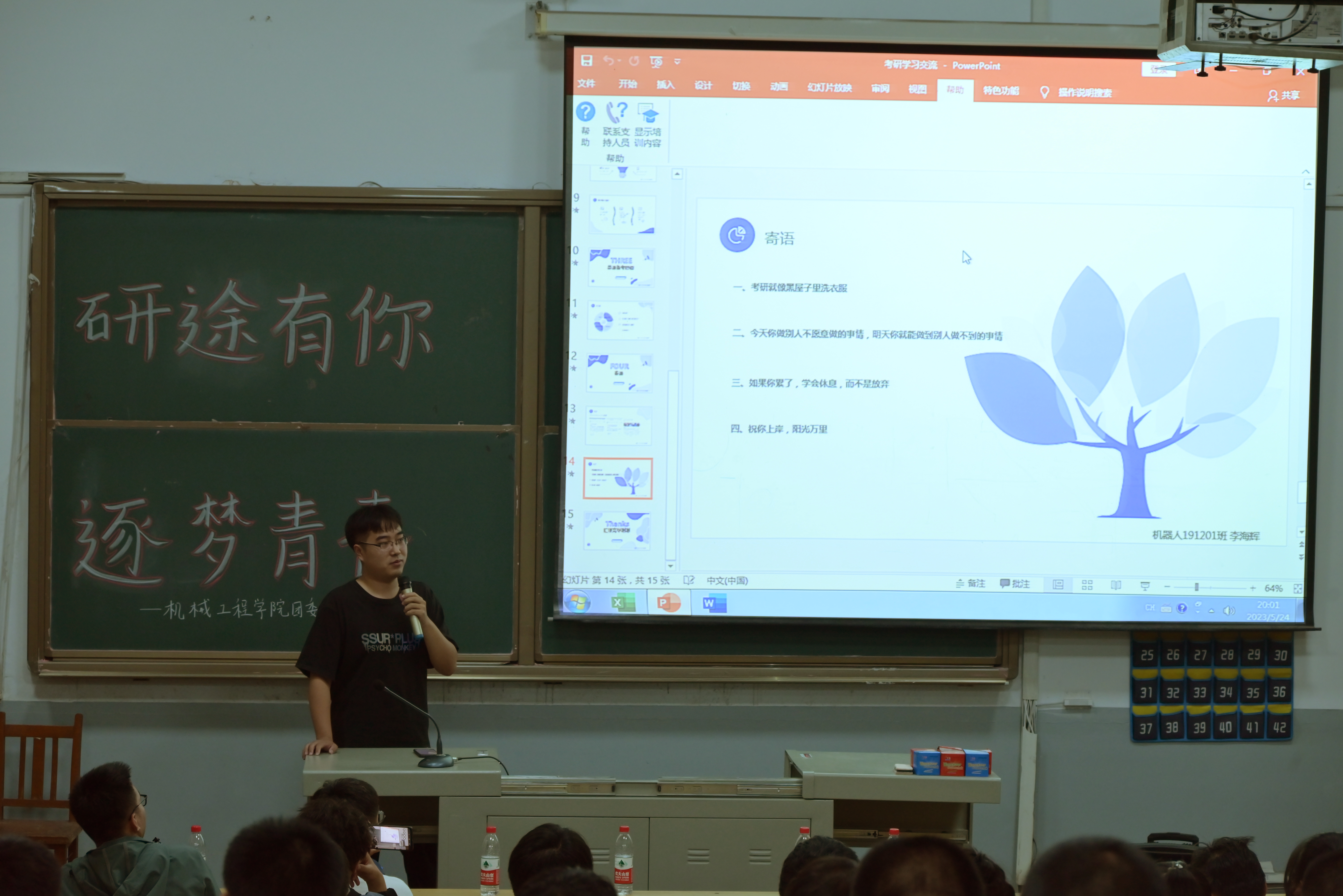 李海辉同学通过PPT讲座的形式向备考学生分享他的考研成果和择校经验,他谈到选择院校需考虑到高校综合能力以及专业实力,但更重要的是要结合自身的实际。最后,他表示:今天你做别人不愿意做的事情,明天你就能做到别人做不到的事情,希望每一位备考同学能够努力走好考研中的每一步,在学习的过程中如果累了,可以学会休息,但不要轻言放弃。