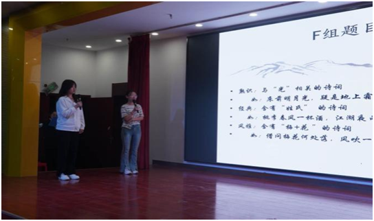 活动中,各学院推荐的19位参赛选手根据编号三人一组共分为六个小组进行上半场对于诗词积累的比拼,由主持人随机放出一组含“熟识”“经典”“高雅”三个难度题目的幻灯片,同组选手上场答题,规定在10秒内依此答出符合题目要求的诗词,否则此轮被淘汰,直到场上只剩一位选手未被淘汰进入下一个难度的比拼,共计三轮。“熟识”题每答对一句该选手积累一分;“经典”题每答对一句该选手积累两分;“高雅”题每答对一句该选手积累三分。由评委判断选手答出的诗句是否符合题意。下半场关于诗词理解的比拼以抢答的形式进行,由主持人放出一组情景共十个题目,同组选手上场根据题意猜对应的诗句进行抢答,答对一题积累5分。最后根据积分决定名次,颁发奖项并确定山西省参赛选手的推荐名单。