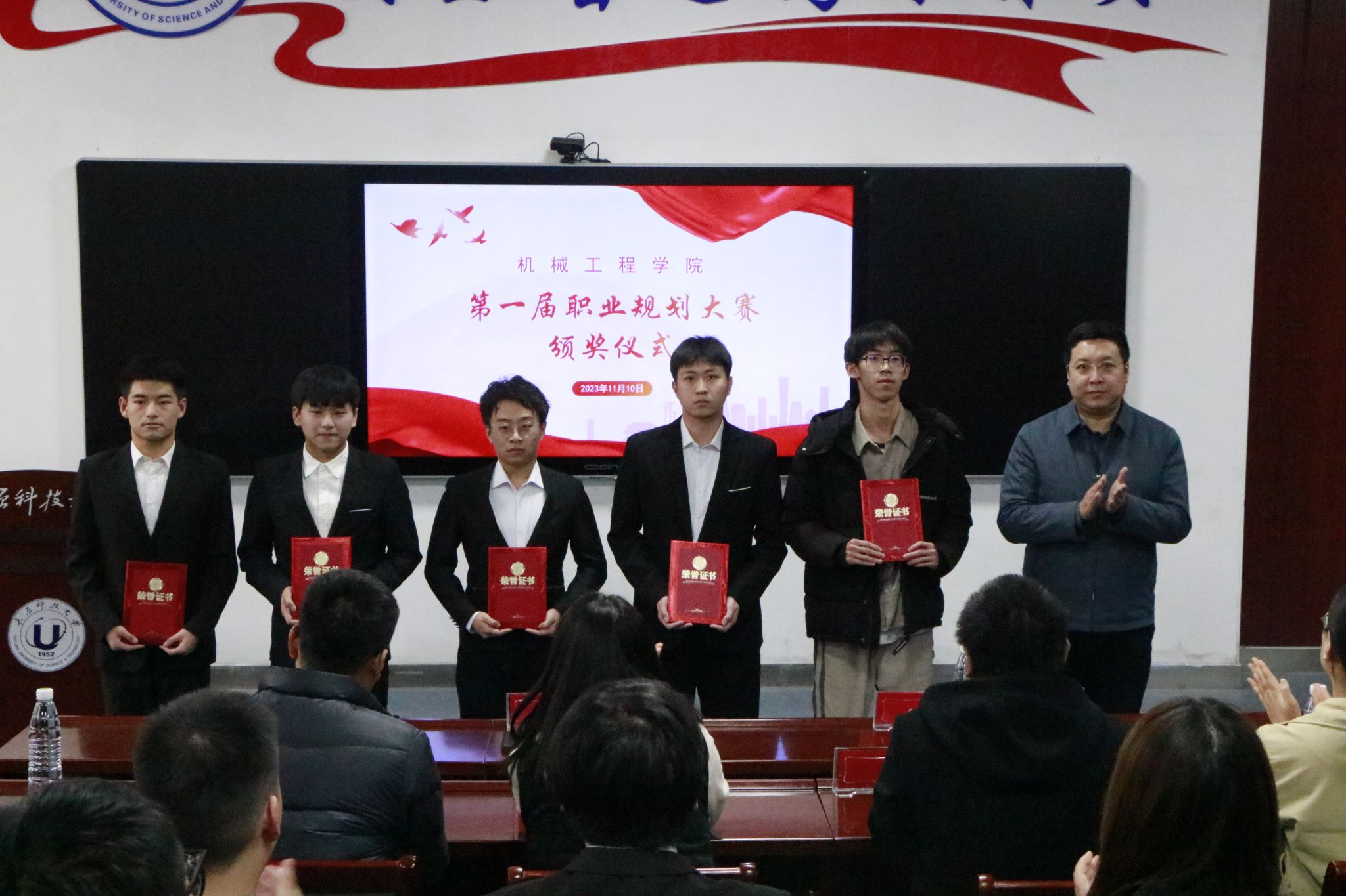 经过两个赛道的激烈角逐,最终2020级季捷等五名同学获得就业赛道一等奖,2022级潘凯等五名同学获得成长赛道一等奖。机自201205班、机自211202班、机自221206班、工设231202班等10个班级获得优秀组织奖。学生工作部部长赵明煜、太阳成集团tyc122ccvip党委书记赵宇出席比赛闭幕式并为获奖选手和组织颁发荣誉证书。