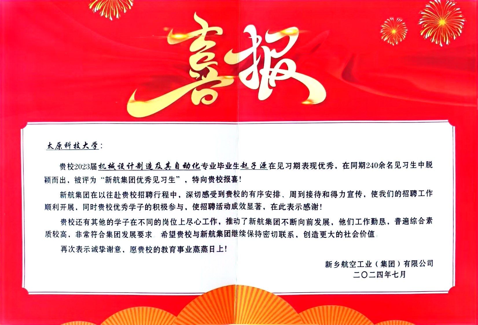 近日,新乡航空工业(集团)有限公司向学校发来喜报。我院2023届机械设计制造及其自动化专业本科毕业生赵子源在见习期间表现优秀,在同期240多名见习生中脱颖而出,被评为“新航集团优秀见习生”。
