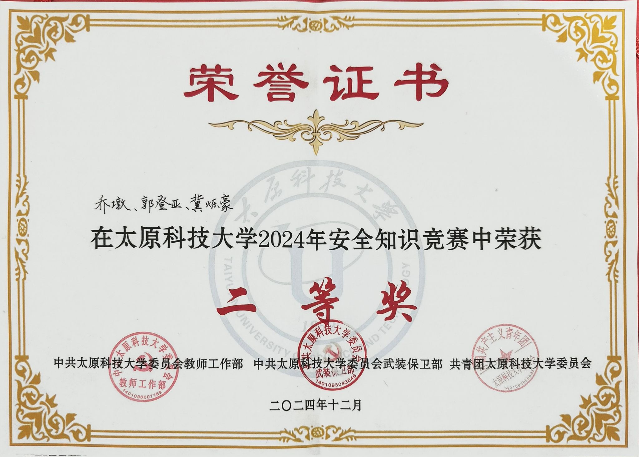 这一荣誉的获得,不仅仅是我院学生代表队出色表现的肯定,更是对学院安全教育工作的高度认可。此次安全知识竞赛的举办,不仅提高了全校师生的安全意识,也为创建平安校园奠定了坚实的基础。太阳成集团tyc122ccvip将以此为契机,进一步加强安全教育工作,提高学生的安全意识和自我保护能力。同时,学院也将继续发扬团结协作、勇于拼搏的精神,为培养具有社会责任感和安全意识的高素质人才做出更大的贡献。