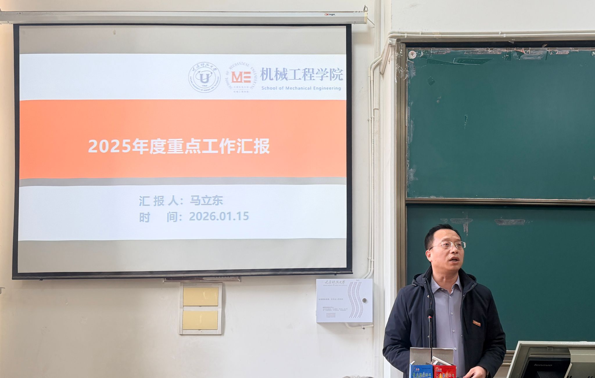 大会由院长马立东作学院年度重点工作报告。他系统总结了2025年在人才培养、科研创新、学科建设、师资队伍建设等方面取得的进展,包括顺利通过工程认证、科研到款突破7662万元、新增多项省部级科技奖励与重点实验室,以及引进一批高层次青年人才。报告还结合学校“十五五”规划,明确了学院在博士生规模、专业优化、国家级课程与教学名师培育、科研经费增长与成果转化等方面的目标,为学院下一步发展指明了方向。